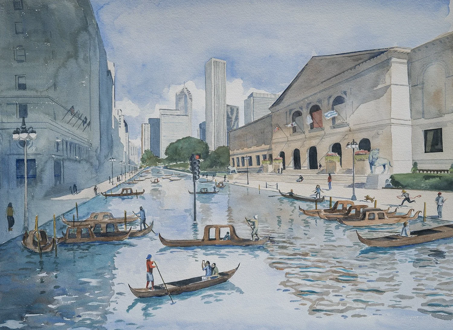 <i>Michigan Ave Gondolas</i>, 30 x 22", watercolor on paper, 2020 (Copy)