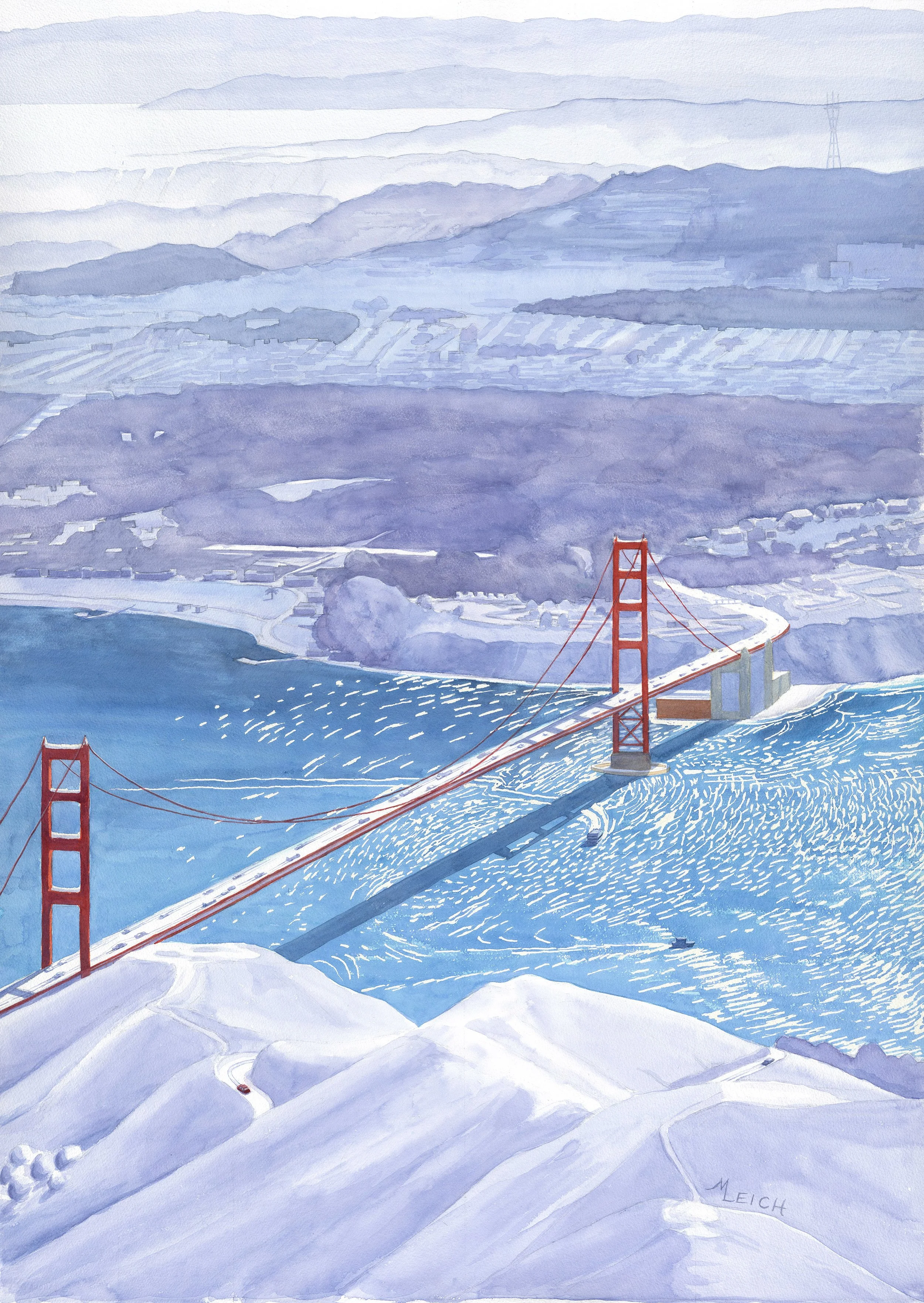 <i>San Francisco in the Snow: Golden Gate"</i>, 29 x 41", watercolor on paper, 2022 (Copy) View fullsize